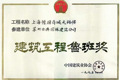 1995年 苏州古典园林建筑公司参建的上海豫园商城天裕楼获国家最高建筑奖项“鲁班奖”,是我们获得的第一个“鲁班奖”。