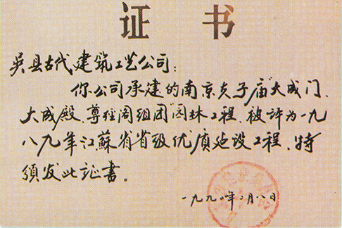 1989年 吴县古代建筑工艺公司承建的南京夫子庙“大成门、大成殿、尊经阁组团”园林工程被评为江苏省优质建设工程。这是我们获得的最早的省级“优质工程奖”荣誉。